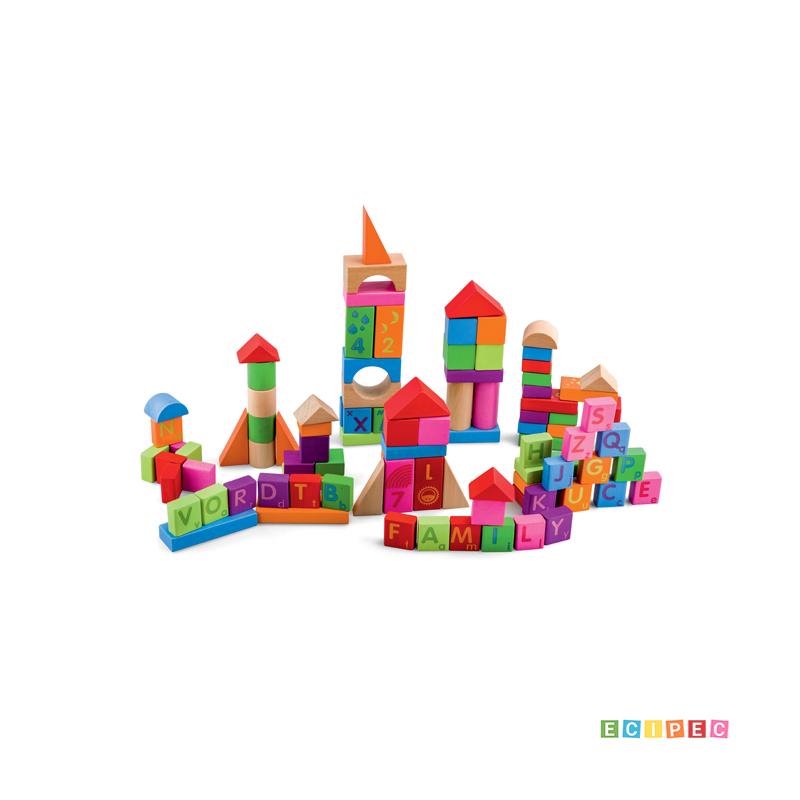 Dimenzije: prečnik 18x22 cm. Uzrast: Za decu stariju od 12 meseci. Kocke nikad nisu samo kocke! U veštim rukama one će postati farme, gradovi, viteški dvorci, lavirinti, svemirski brodovi... Mali konstruktori izgradiće vozila, dizalice, robote ili visoke nebodere. predstavljaju idealnu igračku za razvoj mašte, kreativnosti, intelektualnih i motoričkih sposobnosti kod dece. Igračka se sastoji od 100 geometrijskih oblika i vrlo je bitno da dete u toku igre koristi što veći broj delova. Uz pomoć kocki dete se zabavlja i svaki deo bloka posmatra kao deo celine, uočavajući i shvatajući odnose između njih. Ceo set sadrži različite geometrijske oblike, u više boja ,koji pružaju mnogo mogućnosti za izgradnju i razviće fine logike, planiranja i logike. Pojedini delovi na sebi imaju slova engleskog alfabeta, dok su na drugima predstavljeni brojevi od jedan do devet.