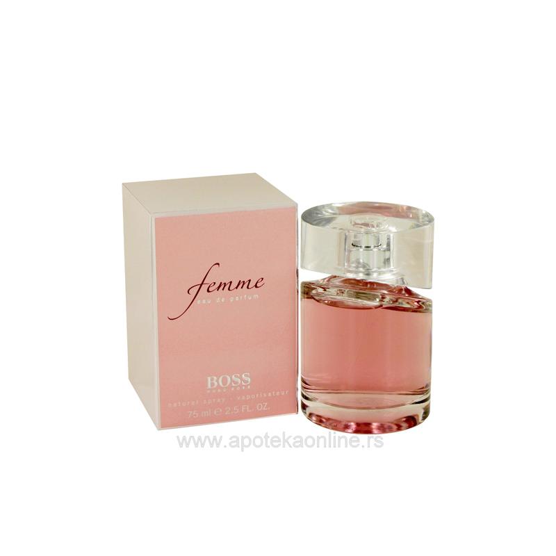 Femme je pesma posvećena Ženi. Žena Boss je pre svega romantična i vedra. Ona je sanjarka, ona je sama ženstvenost kako je zamišljaju muškarci. Parfem je ležeran, blistav i radostan, sa voćnim svetlim uvodom od tangerine, crne ribizle sa dodirom frezije. Cvetno srce je nežno i ljupko kao bidermajer od belog cveća: jasmina sa Madagaskara, ljiljana i ruže. Dugi trag se talasa mošusnim notama u harmoniji sa nežnom kožicom kajsije i drvetom limuna. Parfem je napravljen 2006. Grupa: cvetni voćni miris Pakovanje: 75ml Svi parfemi na apotekaonline.rs su originali!